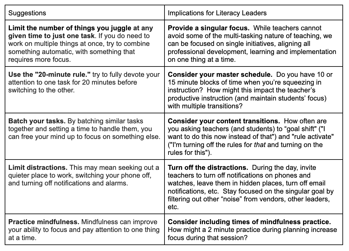 There are 9 goals, each with related action items and systems to create. While all of these are important, let’s consider, what is the impact of focusing on everything each year? How does this impact instructional time? Let’s look at the research on multitasking, known as trying to perform two or more tasks concurrently. What actually happens when we are “multitasking” is that we repeatedly switch between tasks or leave one task unfinished to begin the other. (Madore & Wagner, 2019) “multitasking is almost always a misnomer, as the human mind and brain lack the architecture to perform two or more tasks simultaneously. By architecture, we mean the cognitive and neural building blocks and systems that give rise to mental functioning. We have a hard time multitasking because of the ways that our building blocks of attention and executive control inherently work. To this end, when we attempt to multitask, we are usually switching between one task and another. The human brain has evolved to single task.” (Madore & Wagner, 2019) “the behavioral costs of task switching are typically unavoidable: individuals almost always take longer to complete a task and do so with more errors when switching between tasks than when they stay with one task. (Madore & Wagner, 2019) “converging evidence suggests that the human "executive control" processes have two distinct, complementary stages. They call one stage "goal shifting" ("I want to do this now instead of that") and the other stage "rule activation" ("I'm turning off the rules for that and turning on the rules for this").” (American Psychological Association, n.d.) When we take the evidence on multitasking into consideration, we cannot ignore the impact on our productivity. There is also some research that points to increased stress levels and diminished working memory. (Davis, 2023 & Cherry, 2025) Pair this with cognitive load theory and the evidence of impact is pretty astounding. (More on CLT next month) If you’ve spent any time in a classroom, you know that teaching is inherently multitasking - we are sharing information with students while simultaneously scanning the room for behaviors and checking for understanding among other tasks. One day of teaching is hours of multitasking (no wonder we come home exhausted and distracted!). Teachers are also dealing with a barrage of initiatives, often all at the same time (as evidenced in the goals I listed in the beginning); they might be learning a new literacy curriculum, data system, student information system, attendance system, new leadership, and navigating changing parent interactions. It’s no wonder that teachers are overwhelmed because of the enormous pressure to switch between tasks for hours each day. In fact, researchers have named the issue with this as “switch costs” pointing to all the issues we’ve previously named. What can we do? While there is much we cannot change about what teaching asks of our teachers when they are conveying a lesson, we can keep the implications of multitasking in mind when leading our work. How might we put these implications into practice and decrease the requests we place on teachers shoulders, thereby increasing their effectiveness? As literacy leaders, our work is urgent. We want every child to become a reader tomorrow. And yet, this work takes time, even more so when our attention is divided. If literacy is your north star, chunk down your goals and get clear on the task (not plural) at hand. Leadership Moves: