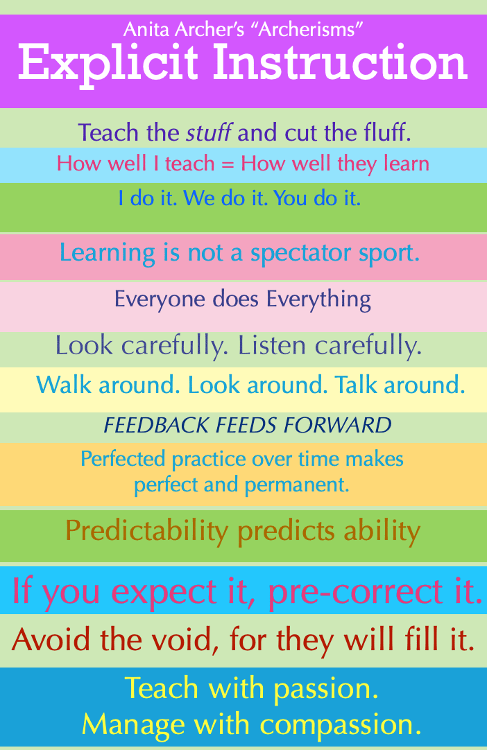 A note: This is newsletter 3 of a 3-part series! Read the part one here and part two here. Your Work MattersTime is the hottest commodity we have in education. We are constantly trying to figure out how to get more of it. We talk about how to decrease bathroom breaks, how to minimize transitions, how to squeeze in the minimum number of minutes for recess, etc. These are worthy efforts. We only get to work with our students for approximately 180 days per year, with about 5-6 hours of instructional time. When so many schools are pressured to make gains that require more than a year’s worth of growth, we have to squeeze instruction into every precious second. (That’s if we aren’t battling a chronic absenteeism problem, which has decreased but not to pre-pandemic rates - read more here). If you’ve been in the Science of Reading world for a minute, you’ve probably heard of Anita Archer and her Archerisms (shown above). Archer is the co-author of Explicit Instruction: Effective and Efficient Teaching, which highlights HOW we can teach the content many of us are learning in our Science of Reading journey. In Archer’s and Hughes’ book (2011, p. 7) , the authors share 8 Ways of Optimizing Instructional Time: