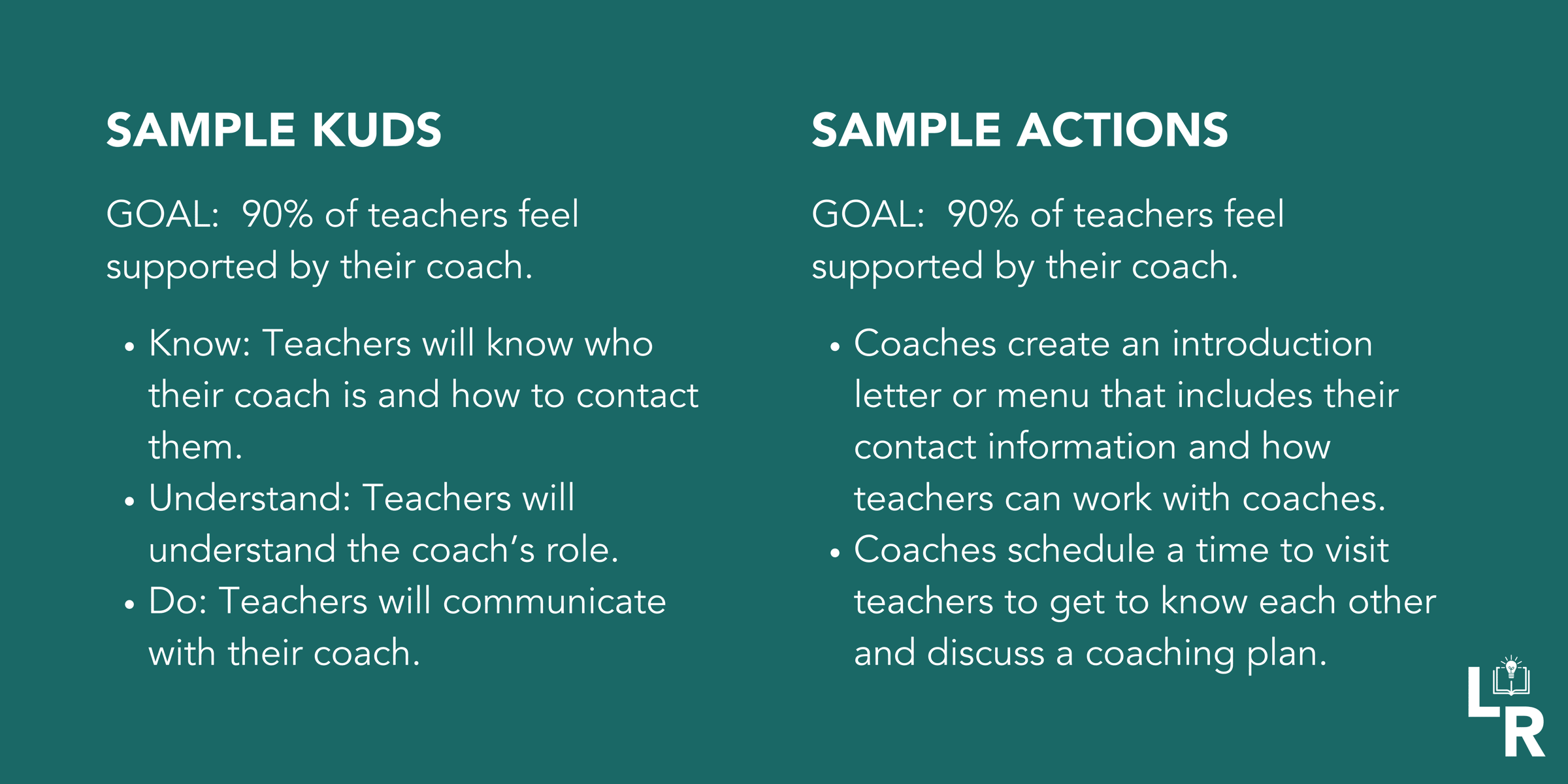 This month, I kicked off long-term work for the year, continuing to work with district instructional coaches. We had our beginning of year workshops in which we developed coaching goals then “Chewed the KUD” by getting clear on the Know-Understand-Do and associated actions to achieve those goals. Together, we developed aligned 30-60-90 day strategic plans to provide focus for the first quarter.