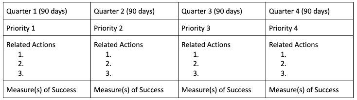 This is why I love 90 day planning - we can identify/map our priorities over the course of the year and backwards map exactly how we will get there. Below is a rudimentary sample - I typically break it down into the 30-60-90 day action plans for each priority/goal.